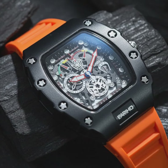 EARIHO Sport Skeleton Chronograph Watch | Black Case with Orange Silicone Strap