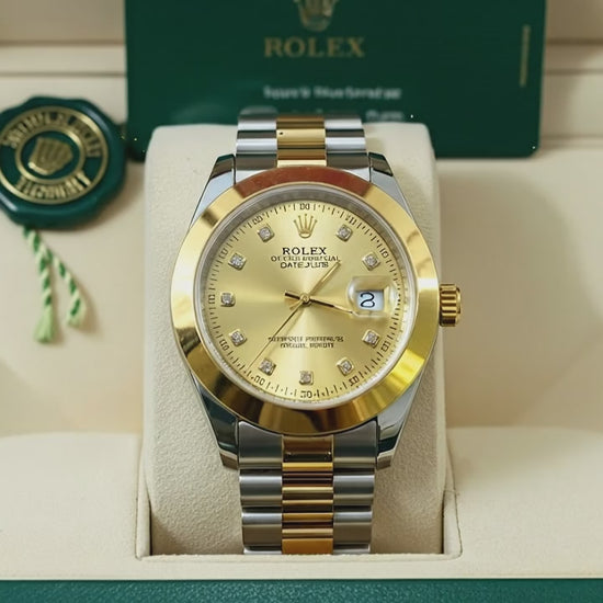The elegant champagne dial is adorned with diamond hour markers, offering a refined sparkle that reflects Rolex’s unmatched attention to detail. -