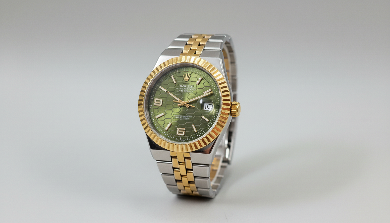 The dial features Rolex’s signature deep green finish with a textured geometric pattern, offering a distinctive look that exudes both class and character. Its subtle sheen captures light beautifully, ensuring your wrist always draws attention. -